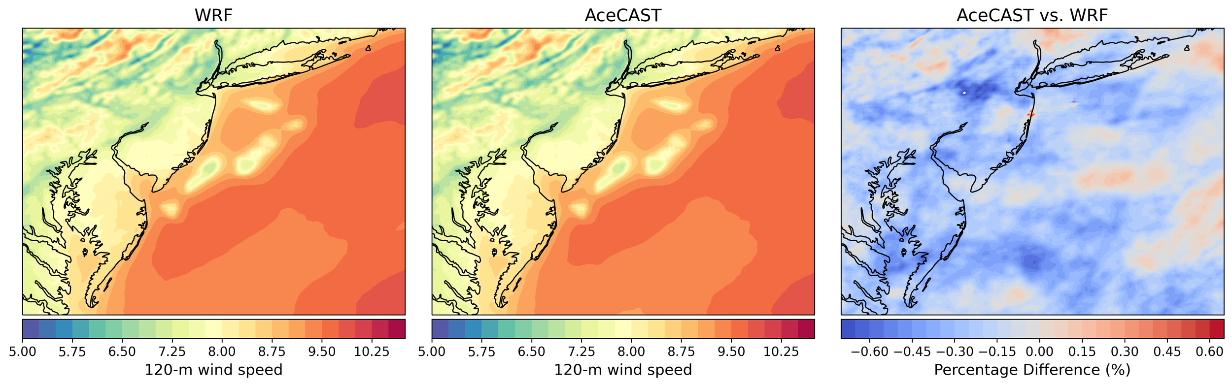 Mean wind speed difference analysis between WRF and AceCAST demonstrates minimal variance while achieving 5x performance improvement